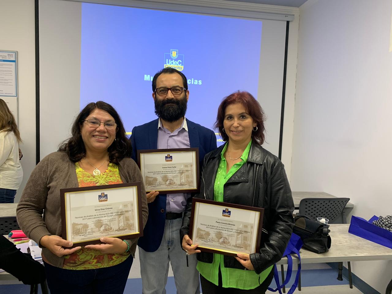 En el marco del proceso de Certificación del Servicio de Asistencia Tecnológica y de la Creación de la Unidad de Calidad de nuestra Facultad, tres integrantes de la Comunidad FCQ, el Prof. Carlos Peña ; la Jefa de Laboratorio del SAT, Paola Concha y la Químico Analista, Virna Díaz, se capacitaron exitosamente en la NCh ISO 17025:2017, la que incluye una nueva estructura, diferente a la de la antigua NCh ISO 17025:2005.