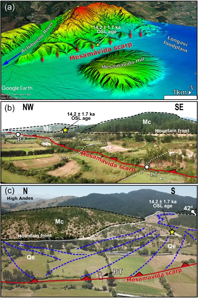 Antes de la estadía, Florencia ya había realizado el trabajo de investigación bibliográfica y de terreno en la falla, ubicada en la región del Maule, en el límite entre las comunas de Longaví y Linares. Con la información previamente disponible sobre las tasas de deslizamiento, el desafío era, detalla, seguir ampliando el conocimiento del tema y también evaluar potenciales sismogénicos un poco más acotados que puedan servir para medir el riesgo sísmico en el que está la provincia”.